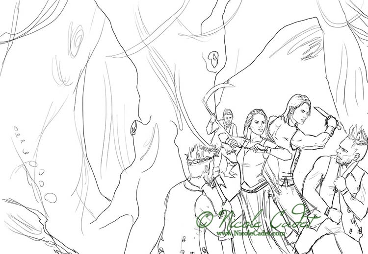 The brief was based on a scene in the book which had a lot of complex elements. 5 characters, each with detailed descriptions, green skinned characters in leather garb against a forest background, and one blue skinned character who is central to the novel. The original brief called for the female character to be on top of the rock, but the client and I agreed that it took the focus away from the two main characters and just didn’t work for the purpose of the commission.